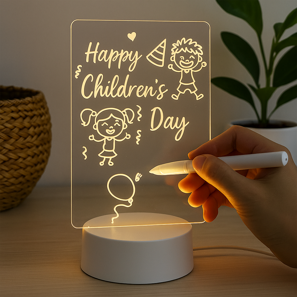 Con esta elegante Glowzy, que cuenta con un panel acrílico escribible, cada palabra que escribas se transforma en luz.Perfecta para regalar, decorar o inspirar, esta pieza combina diseño moderno con un toque emocional que cautiva,ideal para aniversarios, cumpleaños, San Valentín, Navidad o simplemente para sorprender a alguien especial con un mensaje que realmente brilla.